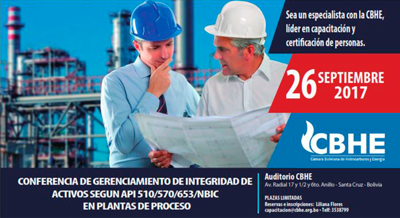 El pasado 26 de septiembre del 2017, la CBHE e INSPECTRA S.R.L. realizaron la conferencia "Gerenciamiento de Integridad de Activos según API 510/570/653/NBIC en Plantas de Proceso” con la participación de representantes de la ANH, YPFB Corporación y sus subsidiarias.